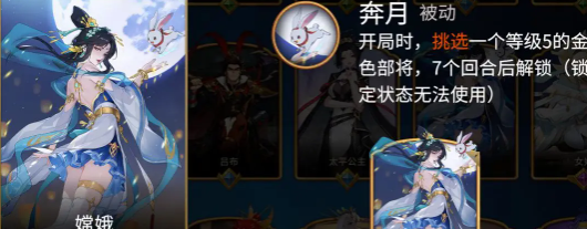 嫦娥对于很多玩家来说就是最爱。被动技能奔月,在开局时就可以锁定一张五费金色部将。8个回合解锁就相当于免费拿到6费卡,所以资源福利还是很出色的。前期建议果断空四,放弃低质量的打工仔,然后把所有的精力都放在寻找优质四费卡过渡上。毕竟八回合前技能就等同于是白板,硬拼战斗力,只会导致血线快速的下滑。等到解锁金色部将之后,可以选择青龙或者是白虎。