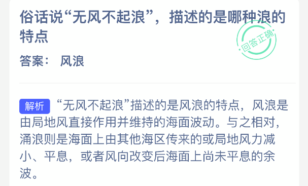 以上就是俗话说“无风不起浪”,描述的是哪种浪的特点?神奇海洋今天答案最新2025年12月24日分享,更多相关攻略内容,请点击关注更新!