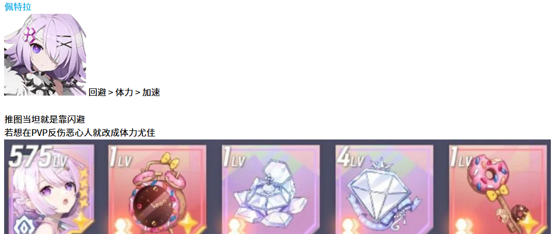 佩特拉的配装思路就完全不一样了。她在队伍里主要承担坦克职责,推图的时候能不能撑住就看她了。回避属性是第一优先级,因为能躲掉伤害比硬抗要划算得多。体力排在第二位,毕竟血量厚一点总是好的。加速属性也不能忽视,跑得快才能更频繁地触发技能。如果要在竞技场用她来恶心对手,那体力就要优先堆高,利用反伤机制消耗敌方血量。
