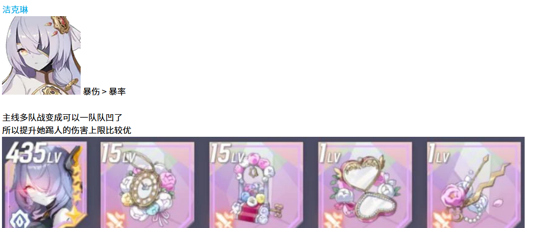 洁克琳的玩法比较特殊,她的踢人技能在多队战里非常实用。随着主线关卡可以慢慢磨了,提升她单次伤害的上限变得更重要。所以暴击伤害必须拉满,暴击率稍微补一下就行。这样配出来的洁克琳才能在关键时刻一脚把敌人踢出场,给队伍腾出空间。