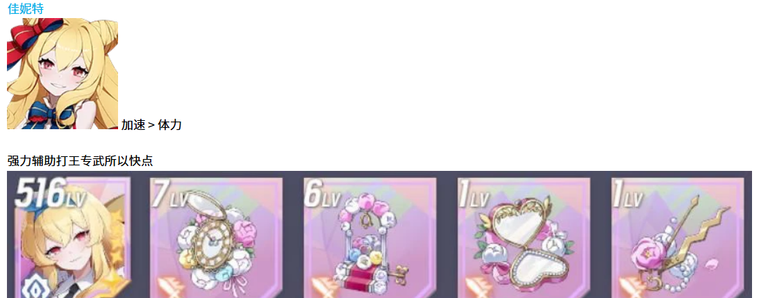 佳妮特作为辅助型精灵,配装的核心是让她尽快放出增益技能。加速属性必须优先堆,体力其次保证她的生存能力。毕竟辅助死得太快的话,后面的战斗就很难打了。专武的效果搭配高速度,能让整个队伍的输出环境变得更好。