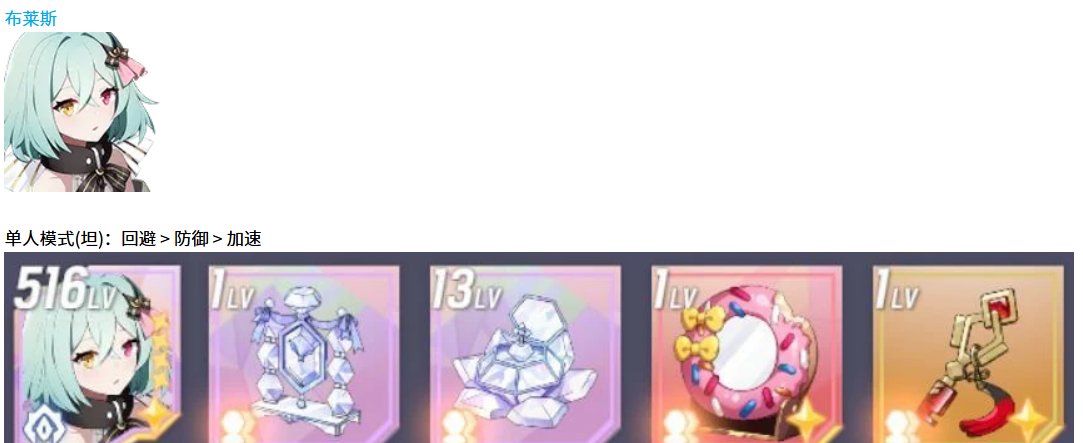 布莱斯同样有两套配装方案。当坦克用的话,回避是核心属性,防御和加速作为补充。推图容易被秒的情况下,高回避能大幅提升存活率。如果队伍需要她输出,比如打黑骑士首领的时候,就换成暴击伤害加攻击力的装备,表现会好很多。