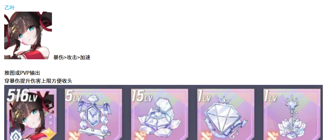 乙叶在竞技场和推图里都是很强的输出角色。暴击伤害依然是首选,攻击力和加速根据实际情况分配。她的收割能力很出色,高伤害能更稳定地收掉残血目标。不过在恶灵讨伐这个模式里,建议优先堆加速,因为她的被动技能需要快速触发才能打出斩杀效果。速度上去了,斩杀的机会就更多。