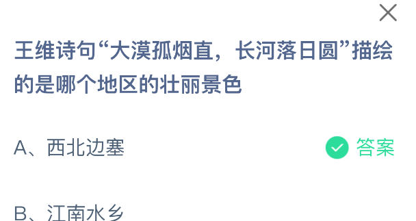 以上就是王维诗句“大漠孤烟直,长河落日圆”描绘的是哪个地区的壮丽景色,支付宝蚂蚁庄园2025年12月26答案最新,更多精彩内容,请点击关注更新!