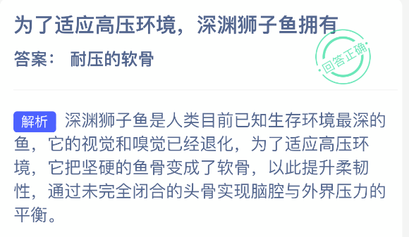 以上就是为了适应高压环境,深渊狮子鱼拥有?神奇海洋今天答案最新2025年12月25日分享,更多相关攻略内容,请点击关注更新!