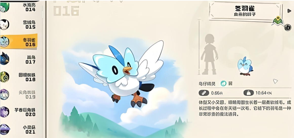 冬羽雀是一种飞行类的精灵,该精灵在游戏的新手期就能顾捕捉到,冬羽雀的飞行速度还算是不错的,最主要的是冬羽雀飞行起来非常的稳定持久,让玩家乘坐冬羽雀不会有任何的颠簸情况。