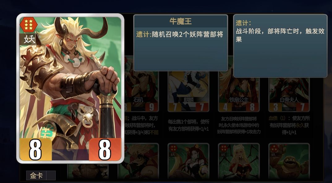 妖族阵营中有不少部将都具备着召唤能力,其中与张角比较好搭配的有牛魔王和白象精,刚巧他们都需要通过遗计来进行召唤,既在他们阵亡时进行召唤,所以可形成牛魔王和白象精阵亡时触发张角血债打出唤雷,召出来的部将阵亡后还能继续触发张角血债再次进行唤雷的效果。最后再上石矶娘娘和白骨夫人作为保底,她们一个可在有部将被召唤时为他们提供加成和不屈,提升召唤部将的作战能力,一个能在召唤时让友方永久叠加属性,增加阵容强度,最后再上个相柳针对对方核心即可。