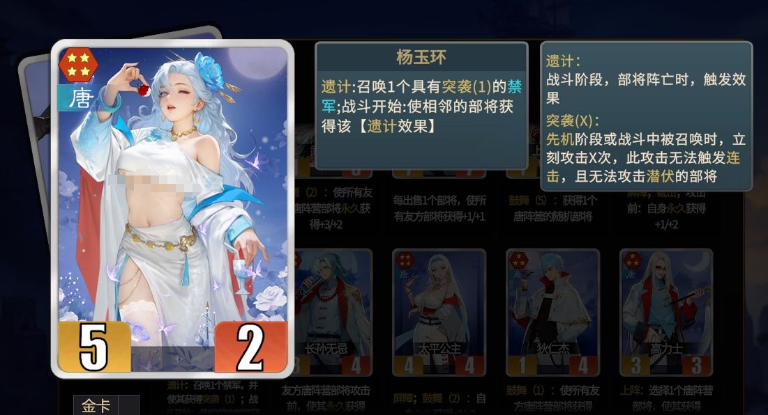 用盛唐阵营与张角搭配也是一样的原理,玩家可上阵多个杨玉环和李秀宁,再配合上玄武可让遗计触发两次的效果,从而召唤出大量的禁军以便触发张角的血债。但与妖族召唤不同的时,盛唐召唤对阵容强度有一定要求,所以得上武则天、秦琼和长孙无忌作为保底,不断地为武则天叠加属性,让她能完成最后的收尾工作。最终的阵容为玄武、杨玉环(两个)、李秀宁、武则天、秦琼和长孙无忌。