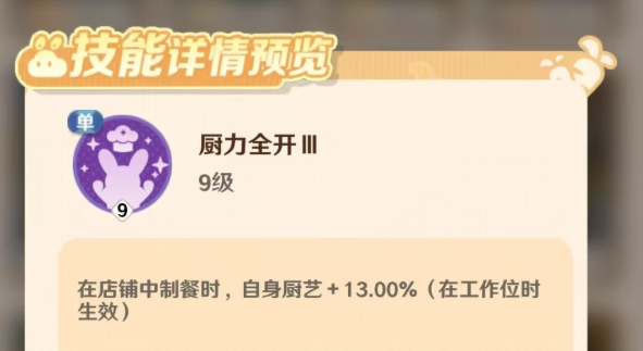 从技能上看,南星的第一项技能“厨力全开”是稳定的增益,只要参与制餐,自身的厨艺就会获得百分比提升,在日常营业中几乎全程生效。第二个技能“移速共鸣”属于团队辅助能力,可以提高所有店员的移动速度,对动线复杂或者客流量大的店铺来说尤为重要,可以明显减少顾客等待时间,提高整体周转效率,是十分实用的隐性收益。