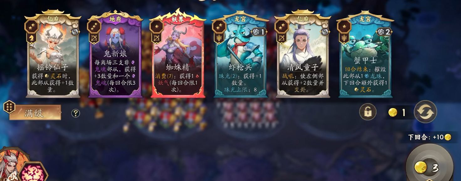 接下来抓住机会拿到五星的忘忧、黑无常、白无常、鬼新娘。用忘忧、鬼新娘的机制,不断地上阵一级的部将去摧毁,快速地刷出小鬼的数量。目标是在四个回合之内让小鬼的数量快速增加到一百个,顺利地升为阎罗。同时也要抓住机会把天书升到六级,为以后的战斗做准备。