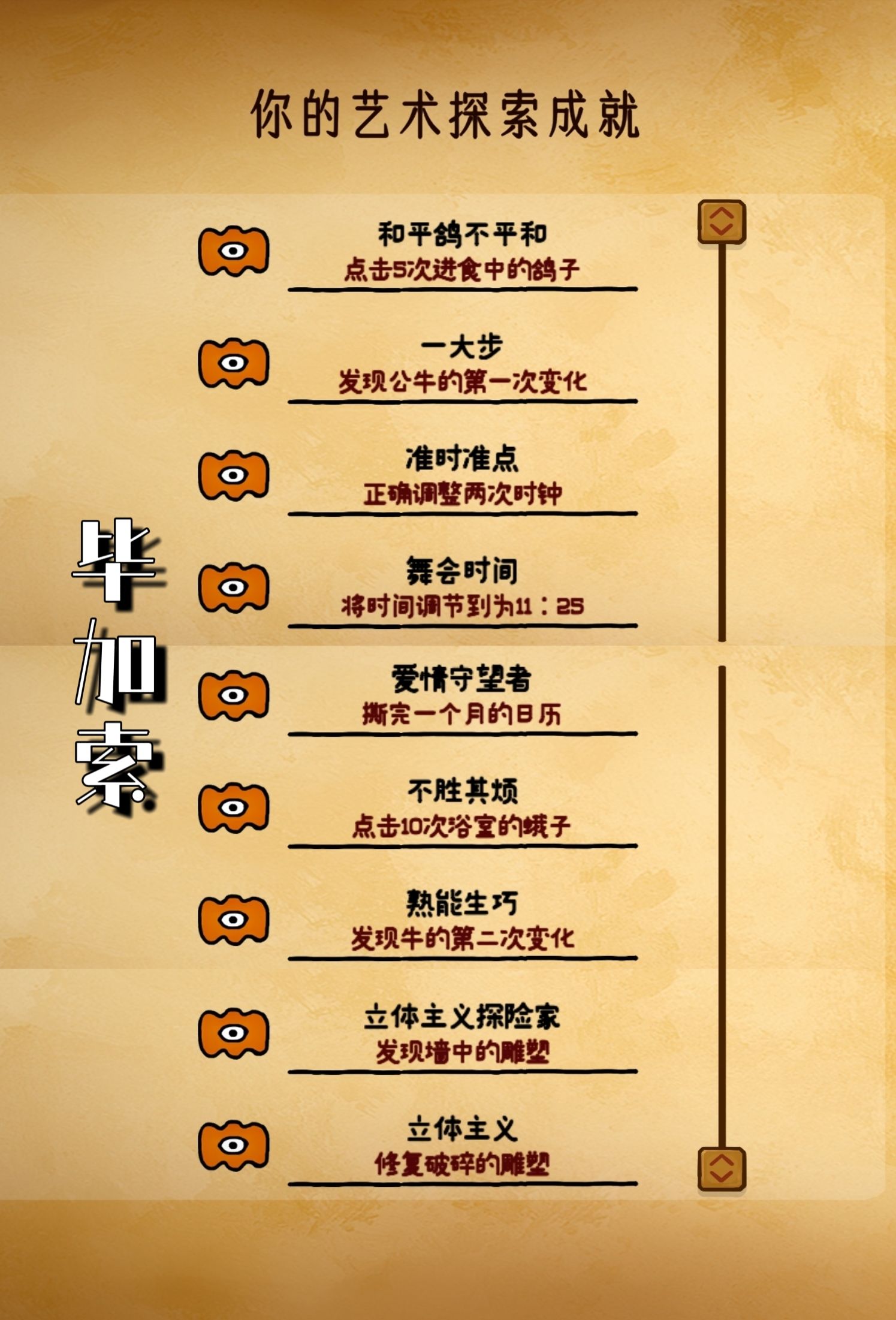 《巨匠眼》毕加索篇涵盖九个成就,其核心达成条件如下:和平鸽不平和需连续点击进食中的鸽子5次;一大步与熟能生巧对应发现公牛的两阶段形态变化;准时准点要求正确调整两次时钟,舞会时间则需调至11:25;通过立体主义探险家与立体主义可探索并修复墙内雕塑;此外,还需完成撕日历、驱赶飞蛾等交互任务。