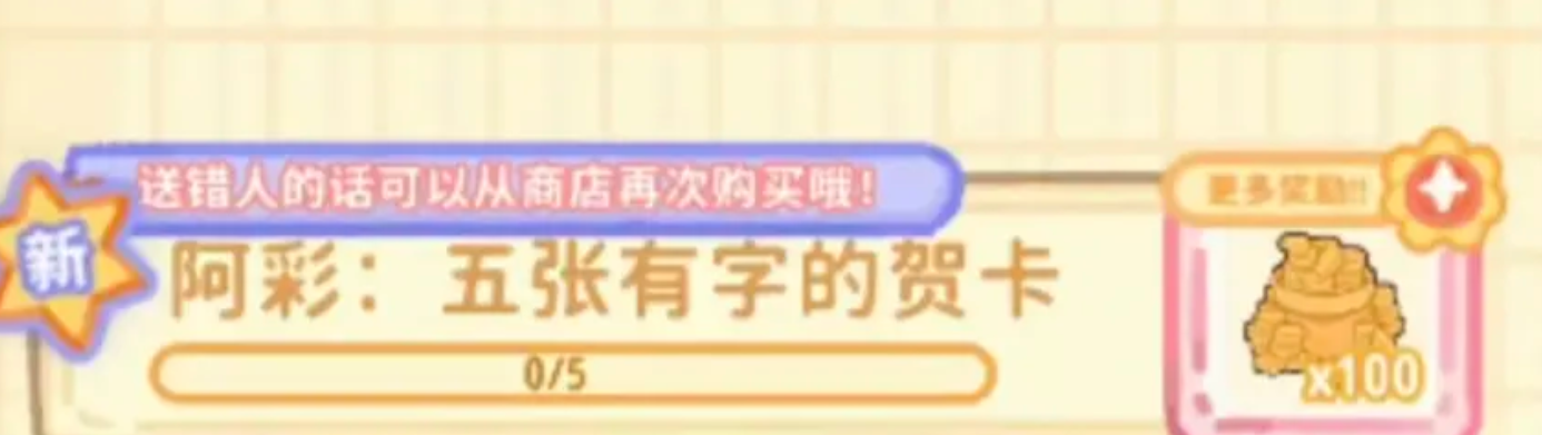 当前版本已实装的“贺卡任务线”,是解锁海报剧情的关键前置环节。任务对象涵盖西装男(位于温馨的家园)、贵夫人、葵葵(街区)、菜鸡老者、小雀(均位于品质社区)等5名目标NPC。玩家需先向他们每人赠送一张空白贺卡,触发“5张有字贺卡”任务目标;随后必须将这5张已书写内容的贺卡统一赠予云彩,方能激活下一阶段。