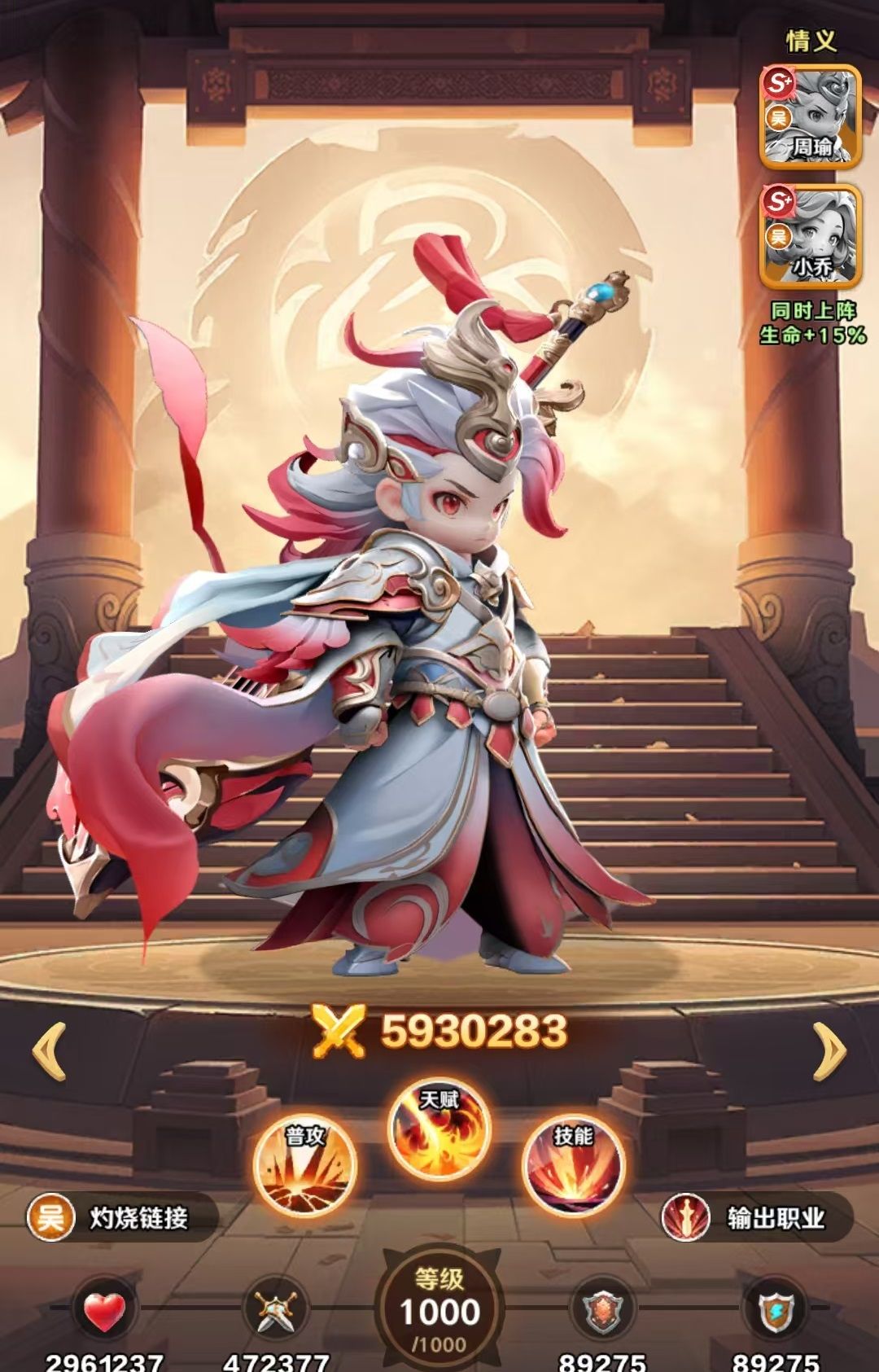 在阵容方面走的就是传统的东吴国家队,具体人选是周瑜、孙策、孙尚香、小乔、孙权和大乔。这样可以完美吃到东吴的羁绊效果,怒气联动直接拉满。这些人选中。周瑜是灼烧的核心,孙策是前排承伤的坦克,孙尚香补输出和控制怒气节奏。小乔负责治疗,孙权提供增益效果,大乔用于辅助。孙尚香偷怒过来给周瑜、孙策提供怒气,然后打出灼烧和爆发的循环。