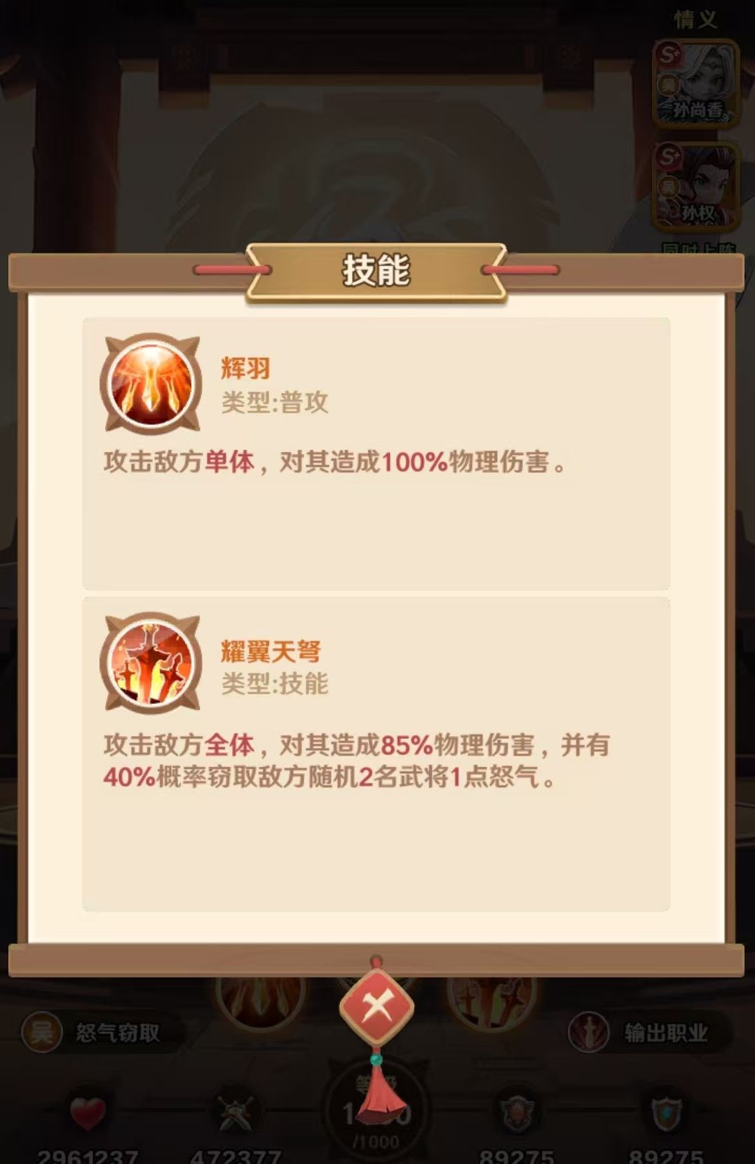 孙尚香是属于巨神军师中东吴阵营的核心武将之一,自身的定位是群体物理输出和怒气控制,既有清场能力又具有团队回怒的能力。该武将在达到九星之后才能实现质变,适配东吴灼烧体系和各个场景PVP选择。在实战中的定位就是群体物理输出,是一个比较稳定的副c兼团队的节奏选手,也是东吴国家队的刚需。孙尚香的普攻是稳定的单体伤害,小技能单体伤害比较高,积攒怒气快,大招可以攻击对方全体,除了造成物理伤害外,还有几率偷两名目标的一点怒气。这样既可以打断对方的大招,又可以加速己方循环。