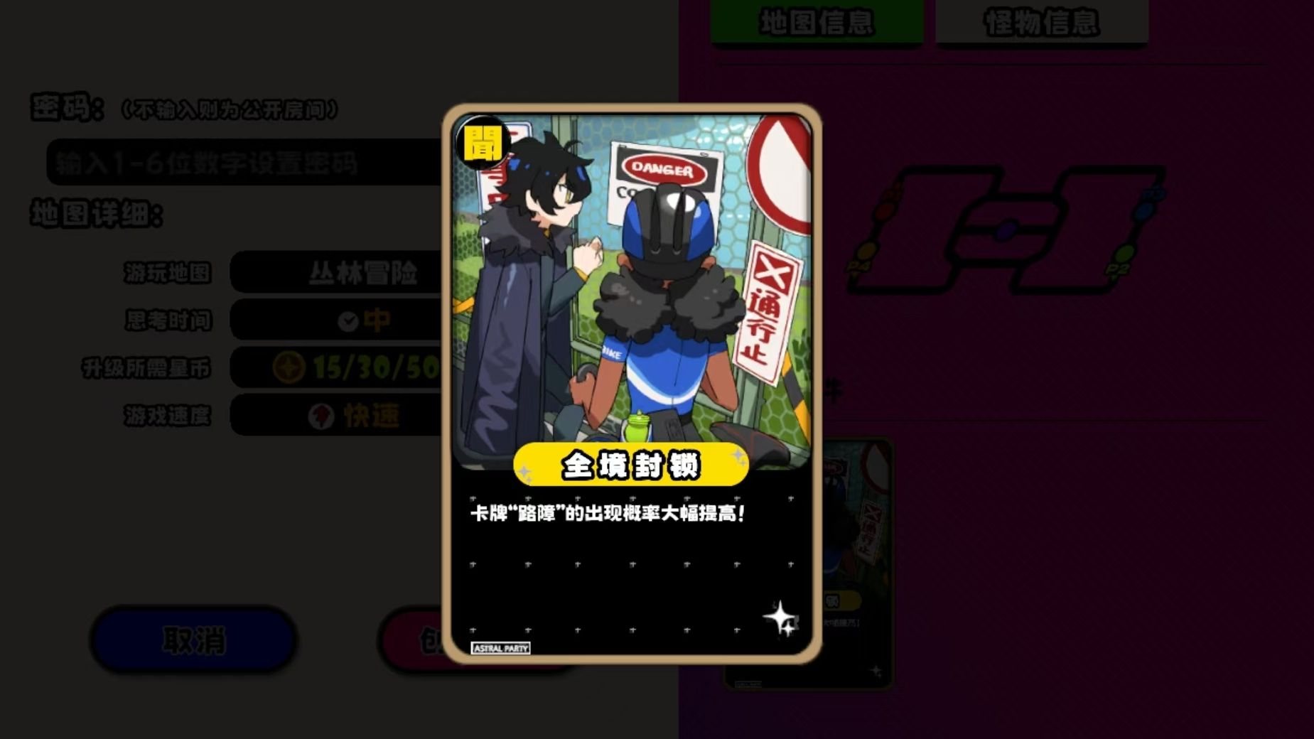 从设计上来看,丛林冒险是张关键路口非常多的标准模式地图,再加上它的机制里存在着路障手牌出现概率提升的设定,所以合理的去利用路障来阻碍他人移动,成为了人们能否玩转丛林冒险这张图的关键。所谓路障手牌,就是能让玩家们在使用它时进行路障放置,当其他玩家路过存在着路障的格子时,不管他们还剩下多少移动点,都会因路障的效果被迫停下来,本回合内无法再继续用移动点来移动。路障被触发后就会消失,不触发时就会一直在地图上存在,并且该手牌没有使用数量限制,只要人们本回合使用手牌的次数没达到上限,且手里还有路障手牌,那就能一直放置。