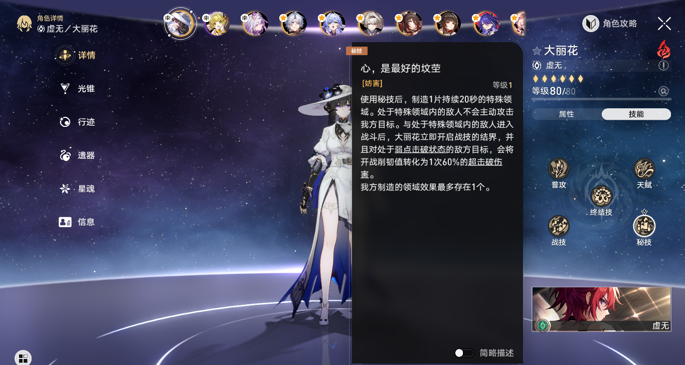 使用秘技后,制造1片持续20秒的特殊领域。处于特殊领域内的敌人不会主动攻击我方目标。与处于特殊领域内的敌人进入战斗后,大丽花立即开启战技的结界,并且对处于弱点击破状态的敌方目标,会将开战削韧值转化为1次60%的超击破伤害。