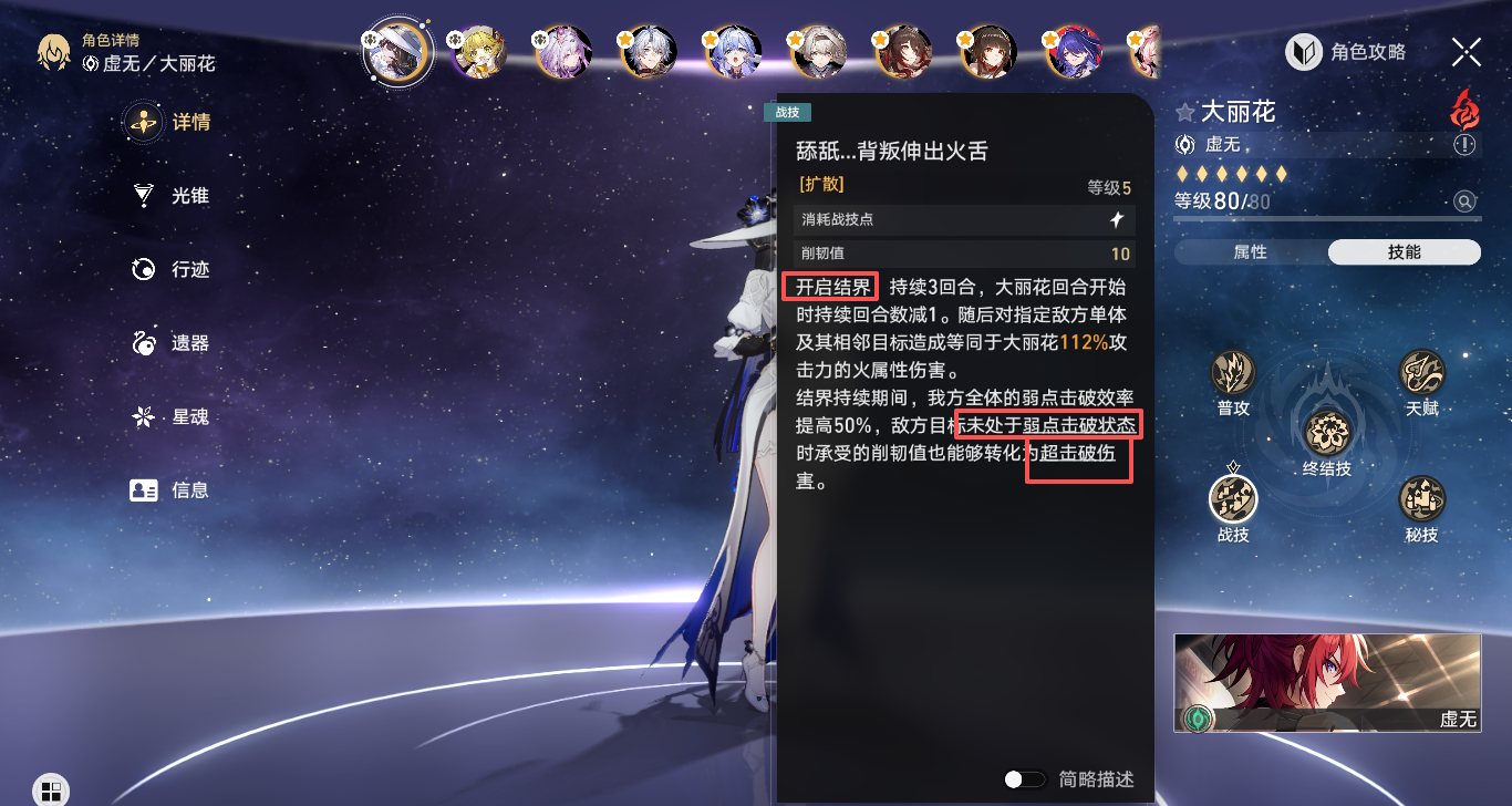 开启结界,持续3回合,大丽花回合开始时持续回合数减1。随后对指定敌方单体及其相邻目标造成等同于大丽花112%攻击力的火属性伤害。结界持续期间,我方全体的弱点击破效率提高50%,敌方目标未处于弱点击破状态时承受的削韧值也能够转化为超击破伤害。