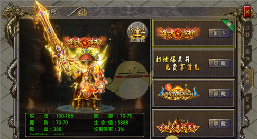 2、给各位勇士介绍些特色的武器及服饰吧!武器部分,饮血狂刀,渴望鲜血,收纳灵魂,可通过开服活动的时装升级获得。涯角龙魂枪,怒斩雪翼雕的利器,可通过游戏活动获得,对攻击、生命、切割等属性均有加成。服饰部分,机甲战神装扮,来自未来的战士,科技代表力量,可通过首充获得,能使激活攻速提升25%。