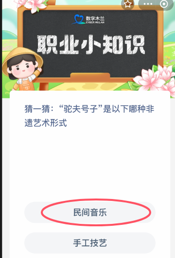 | 1月2日 | 猜一猜“驼夫号子”是以下哪种非遗艺术形式 | 民间音乐 |
