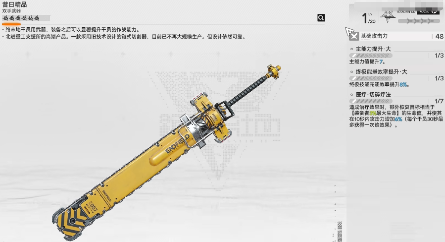 而且在这里大家可以使用的武器类别来根据这里选定的话,也有各种不同的武器技能效果可以使用,第一个为大家推荐的是昔日精品,在当前效果上面,作为一个双手类型的武器可以提升到的主动能力还是非常大的,而且根据终极的能量效率增加之后,大家可以用他的切碎疗法做一个技能效果,在利用武器造成了治疗效果之后,可以额外让其中的恢复目标带来装备5%最大生命值的回复,此时进行治疗的话,可以使敌人也就是装备他的角色,在10秒内攻击能力上面增加6%,每一个干员装备他的情况下,30秒之内都可以获得一次这样的治疗,所以在此进行一些治疗支撑的话,这个武器还是不错的。
