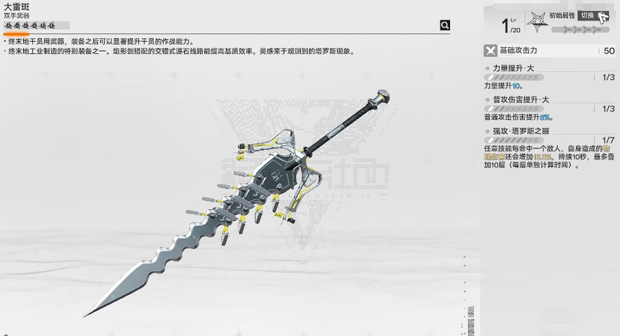接下来为大家介绍的就是塔洛斯漩涡,这在当前是属于一个非常不错的长炳武器,它在基础的攻击能力上面可以造成的能力数值提升7%之后,攻击能够达到6%的提升,在压制流转观测这个技能效果上面,可以让他在使用自身站立的时候有足够的精力恢复,精力在8点恢复了之后,可以给他恢复自身11%的冷却时间,当然了这个冷却加速是只能体现在连接器的使用效果上面,每12秒的情况下,这个技能最多触发一次,虽然这个武器技能在使用的情况下,中间需要达到的冷却时间比较多,但是能够给角色恢复记忆的武器还是非常少的,所以放在这里的话能够使用的空间也比较大。