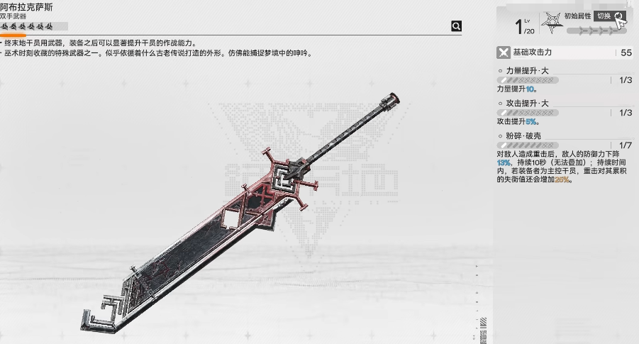 那么接下来为大家推荐的这个武器叫做阿布拉克萨斯,在当前的初始属性上面可以带来的力量提升、攻击提升数值都不高,但是他的技能确实是非常好用,潜在力量属性上面它虽然只能提升15%,攻击提升8%,但是根据他的粉碎破壳这个技能可以给敌人带来的重击效果是非常强势的,而且在敌人在防御下降了之后,可以达到的一个数值是13%的破防效果,后期虽然没有办法进行叠加但是在十秒的时间之内,这个装备者作为控制类型的武器,可以带来的重击会对敌人累计造成足够的失衡值,这里达到的值也有20%的数值了,所以相对大家想要针对敌人的失衡值来进行打击的话,阿布拉克萨斯当前的能力是非常强的。