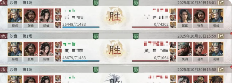 荀彧如果要用的话,最少是升到炽红品质,那么达到这样的一个品质之后,后期其实利用这个阵容,大家甚至是可以直接反制灼烧队的能力,虽然灼烧队当前强度已经被很多玩家夸上天了,但是利用这样一个雷电法王增伤队的话,大家达到的属性来说,也可以用到很多的场景当中利用这三个武将搭配进行搭配的话,要注意其中要搭配的兵种是三藤甲兵,放在第一排的话,这类兵种可以给队伍扛住的伤害还是比较多的,然后利用张角作为核心武将的话,他一定要站在荀彧以及貂蝉的追击格子上面,这样才可以保证张角能够达到足够的二次追击。