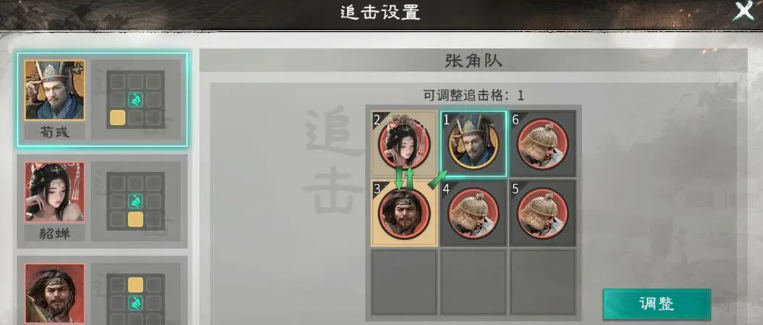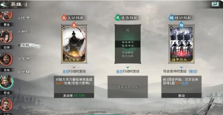 而貂蝉的话,她可以站张角的追击格子当中,荀彧在这里其实不用担心他的追击格子有没有踩到,优先保证貂蝉她能够占到追击,因为三个英雄的话,在这里如果要进行升级,基础都是达到6星品质才可以改变他们在追击格上面的选择,整体队伍在搭配起来之后,荀彧他身上的话可以带天赋效果王佐之才,利用王佐之才的效果可以给张角带来一定的防御以及攻击上面11%的提升之后,还可以带来15点的四维属性增加,在这里利用这样的效果可以让他在被敌人攻击阵亡的时候,还可以保证自己的技能达成足够的生效时间。