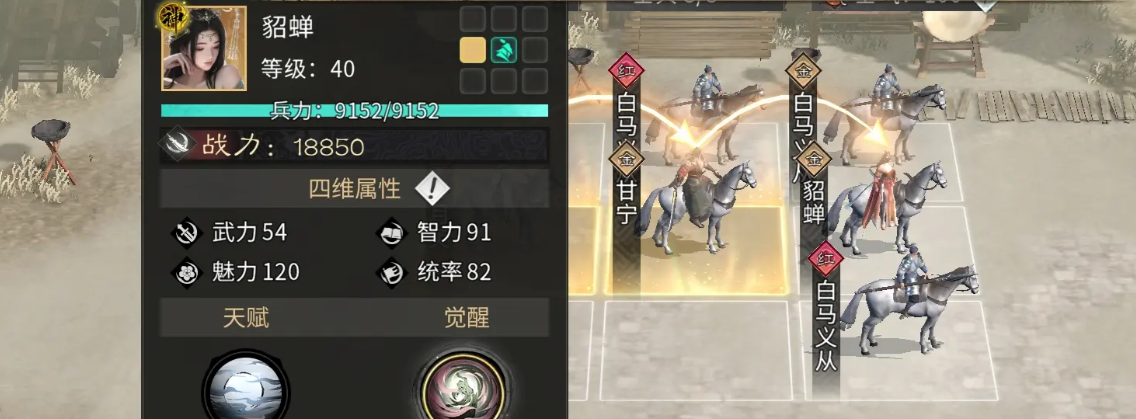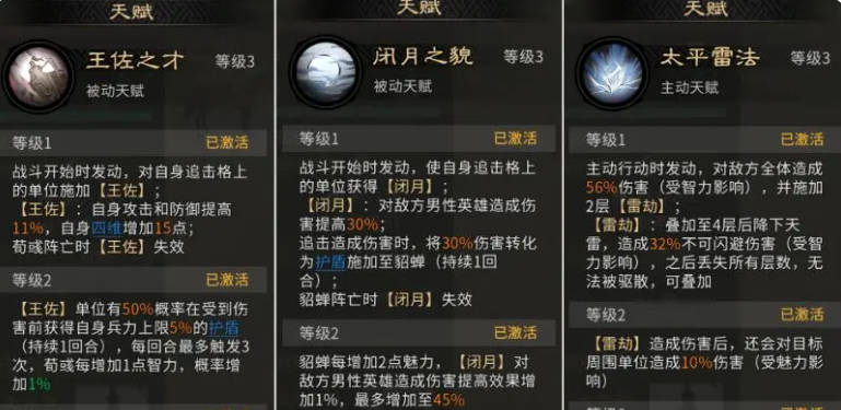 而另外貂蝉自身带的天赋效果叫做闭月之貌,利用这个天赋效果,她也可以让队友对于其他的男性武将输出的时候,在伤害数值上面有30%的提升,因为当前利用貂蝉的这个天赋达到3级的话,另外增加的就是让张角能够触发的追击次数更多一些,次数提升起来之后这里还要注意追击能够造成伤害的话,其中转化的互动能力也会让貂蝉有足够的生存机制,所以当前选用它闭月的状态对敌方造成伤害的话,能够针对一个男性武将造成的克制类型效果会更高一些。