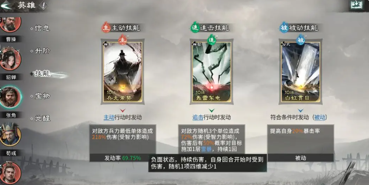 当然这类型伤害是受到这类控制效果,或者是魅力类型影响的,这两类效果进行影响的时候,我方可以克制的角色可能就变少一些了,后期在张角上场的时候,大家一定要注意他现在的主动技能,带兵无常势会更好,因为他基础能力都是群体的,所以没有办法收割残血的话,就可以兵无常势来保证自己弱点效果不会牵扯到其他的队友。