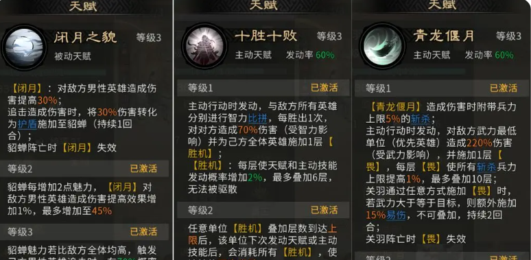 那么在这样站位的时候,大家注意貂蝉的天赋可以带来的是闭月之貌效果,通过这个天赋的能力,可以给对方的一些男性武将造成的伤害自然是会提升更多一些的,而另外利用貂蝉的追击造成一定伤害的时候,其中20%的伤害还可以变成其他的能力,这类能力对于貂蝉的效果来说是可以增加增益的,如果没增加魅力效果达到2点的话,根据这里的能力还可以得到增伤的数值,而在郭嘉的天赋效果上面带来的则是十胜十败,在其中根据他主动技能发动的一些能力,可以根据所有敌方的英雄拿到这里压制的效果。