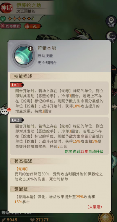 颈槽蛇体质作为伊藤蛇之助的基础增益能力,其中基本就是在上场的时候就可以直接触发的,触发这个效果之后,在上面可以提升伊藤蛇之助20%攻击和10%生命数值,最多的时候是将此类增益技能升级到3级,这个时期提升的数值就到了40%攻击、20%生命和5%伤害加成了,而这个增益基本也是在他达到18星级的时候才可以触发到的强度,最后一个技能叫做狩猎本能,根据伊藤蛇之助最后的这个被动效果,在回合开始的时候,此时场上要是存在蛇毒标记的单位,伊藤蛇之助可以立即对合格目标发动一次恶堕蛇手的技能攻击,而后续这个技能效果会冷却3回合,当然要是当时场上不存在蛇毒标记的敌人,那么此时就会给敌方生命百分最低的那位目标施加一层蛇毒的效果,这个效果在一战斗开始时,就可以让伊藤蛇之助获得10%攻击提升的增益效果。