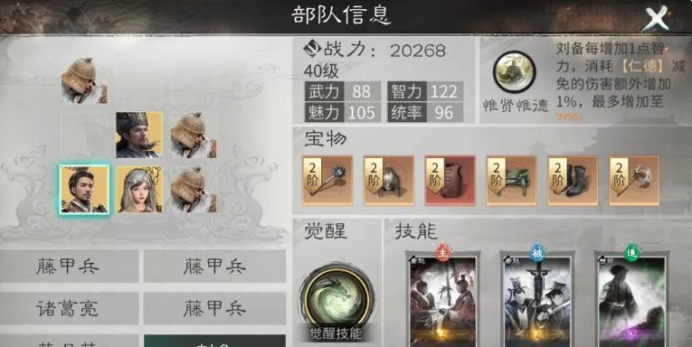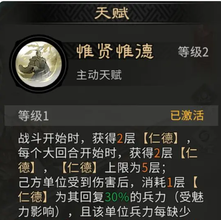 惟贤惟德技能效果触发的时候,刘备一战斗开始就可以获取到两层仁德的状态进行积累,而且在每一个回合开始的时候,他获得的个人的状态上限就可以达到5次,所以在己方单位受到伤害之后,他只要消耗掉其中一层仁德的话,就可以给这个角色带来30%的病例恢复,当然了这个30%的数值不是一定的,如果还有魅力加成的话,他这里会受到魅力状态的影响,在这个角色兵力数值缺少了百分比之后,基础是缺少了30%的时候,利用仁德带来的恢复系数也会进行提升,所以目前刘备作为辅助类型角色效果来说的话,他能够产生的质变效果,依靠天赋就可以快速的克制一些有高频率伤害的敌人。