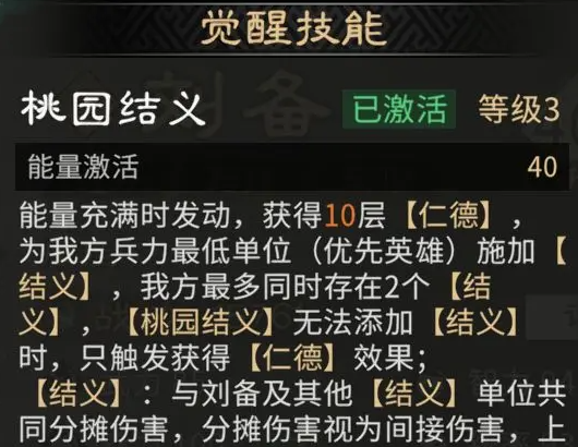 而且他在仁德的层数足够的同时,完全可以在敌人使用了一次群体伤害之后,为我方角色消耗层次进行加成,在刘备进行觉醒之后可以用的技能叫做桃园结义,这个技能可以在能量激活之后进行使用,使用这个技能的时候基本都是刘备在能量充满时的时候进行发动,此时的话他会一次性获得10层的仁德的状态,然后选中我方目前在兵力数值上面最低的一个角色,当然优先选择的这个角色肯定是主要的武将角色,进行施加结义状态,这个结义状态就是我方当时同样存在两个结义状态当中的角色,来进行共同的分摊伤害,这个结义其实在于当前选择当中是刘备跟其他的结义角色一起共同分摊对面带来的伤害机制。