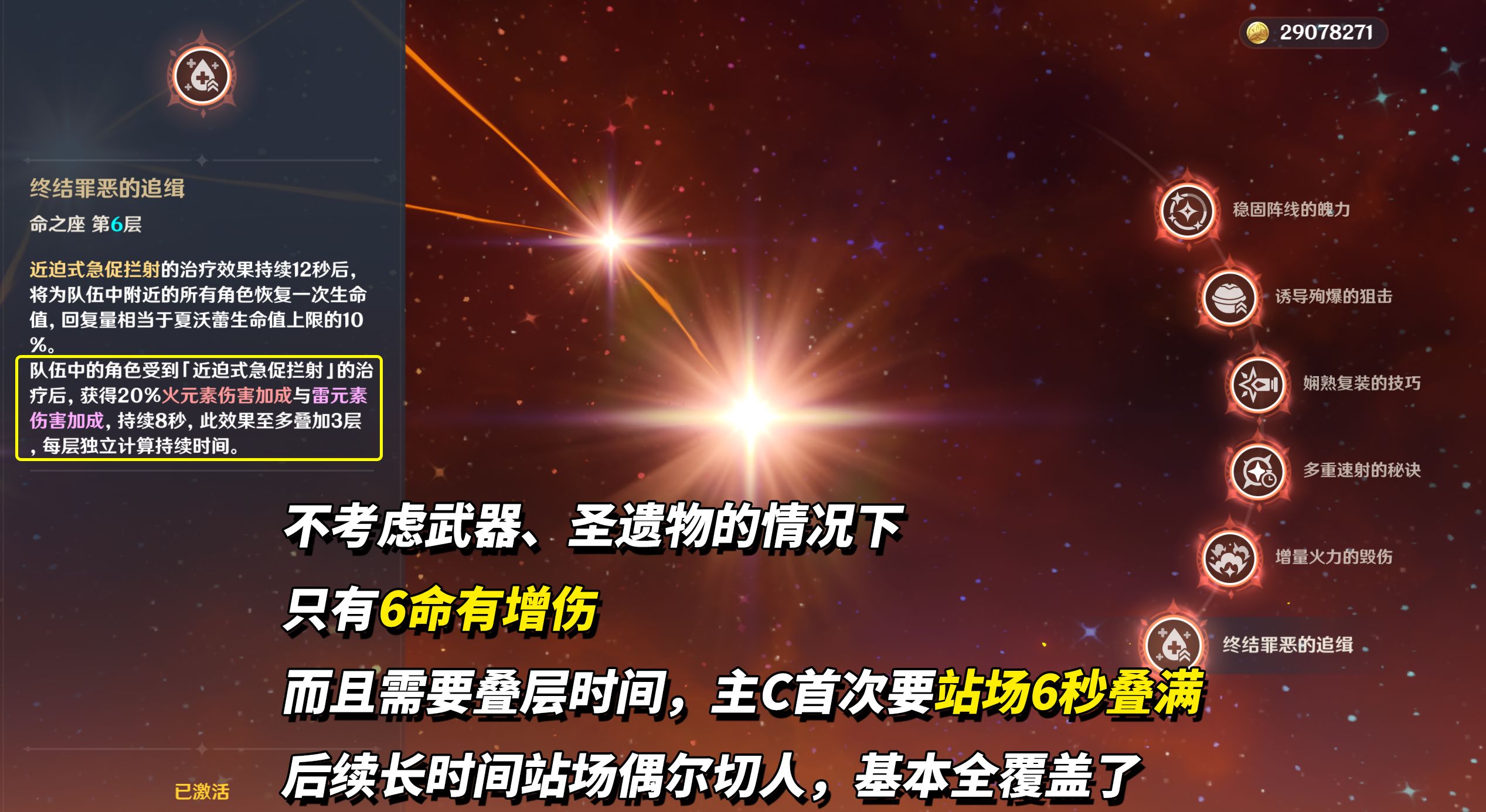 在不涉及武器、圣遗物的情况下,夏沃蕾唯一增伤手段,6命机制。雷火角色受夏沃蕾战技治疗后,每次治疗提升20%雷火增伤,至多3层,即60%雷火增伤。