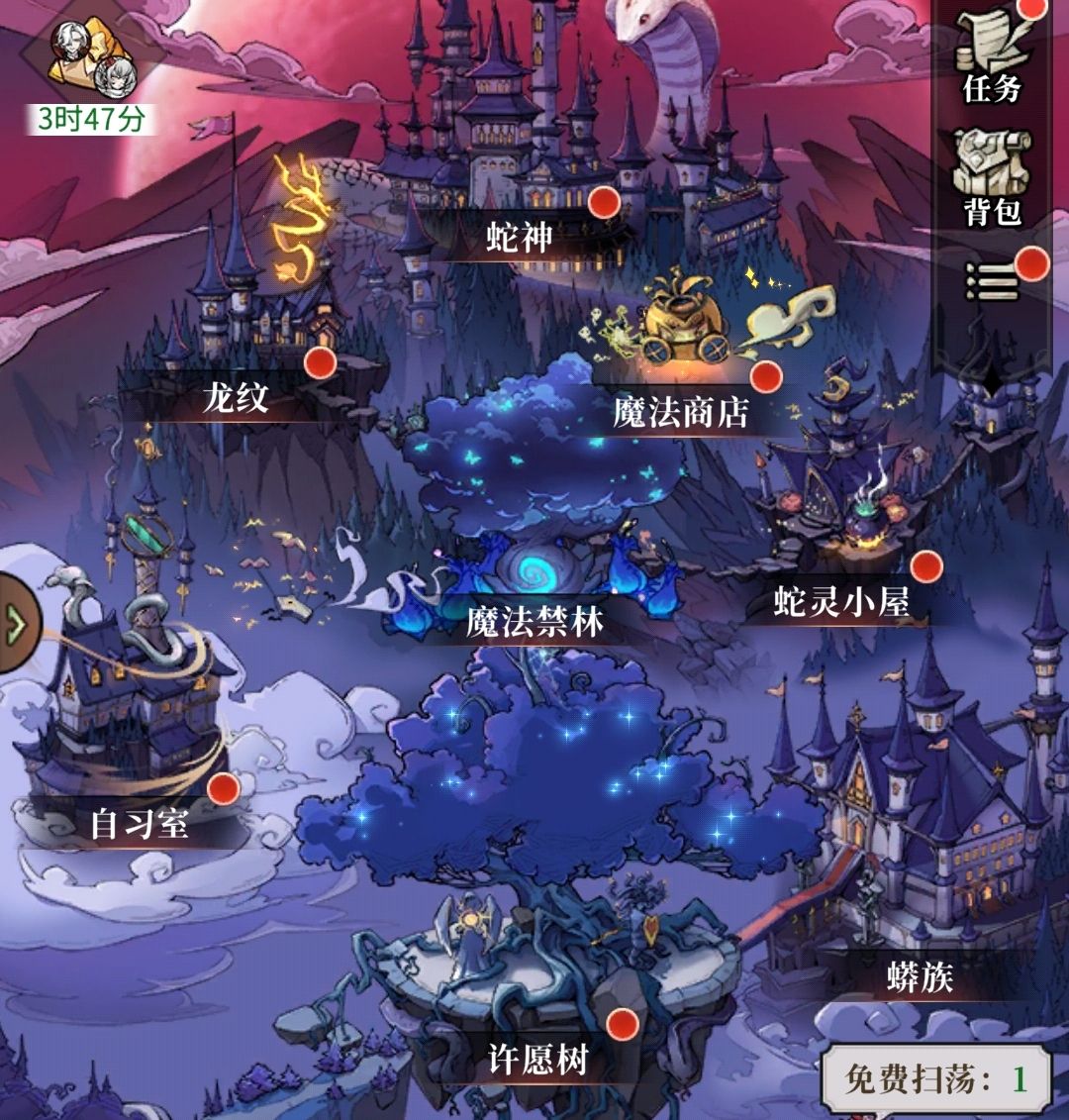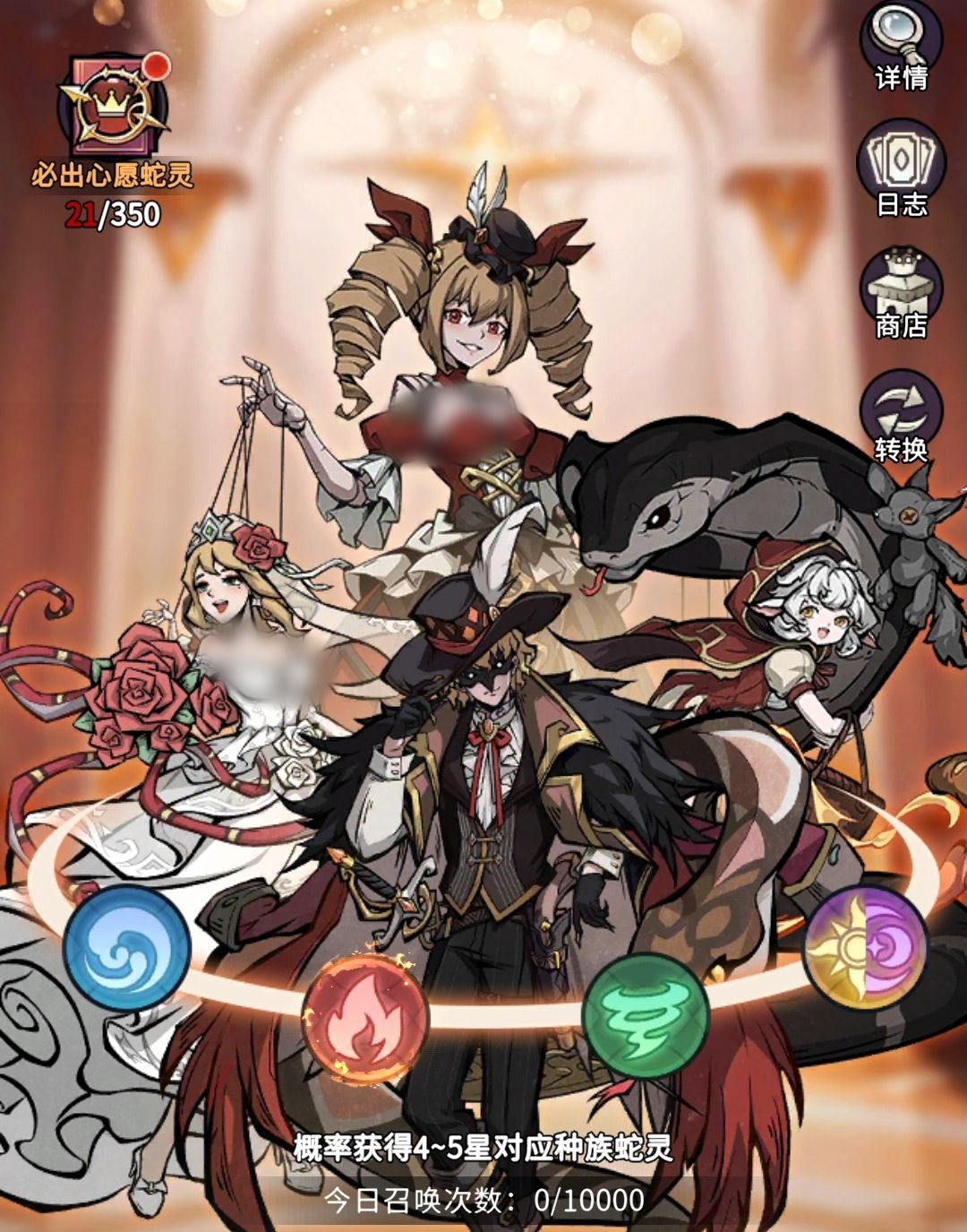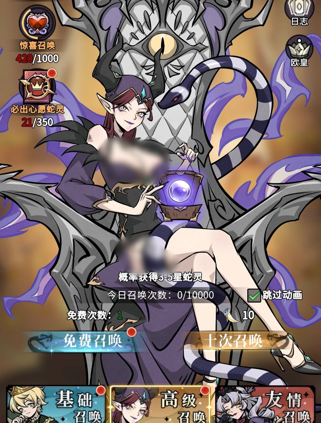 蛇灵召唤是人们最常用的许愿树功能,各位可在里边进行蛇灵的抽取。它分为基础召唤、高级召唤和友情召唤三种,其中基础召唤使用蛇鳞来抽取,可抽出2至5星蛇灵,高级召唤则用蛇牙来抽取,只会出现3至5星蛇灵。友情召唤需要消耗好友增送给自己的金玫瑰,100朵金玫瑰可进行一次抽取,与基础召唤一样能抽出2至5星蛇灵。