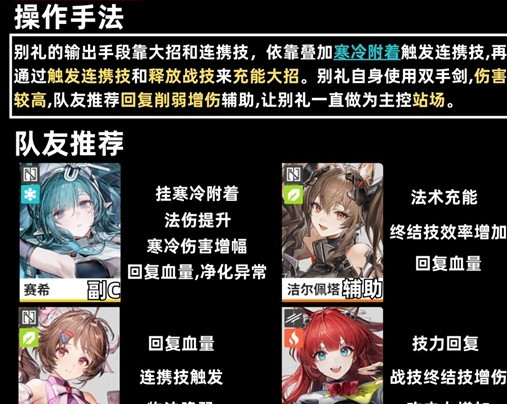 作为冰队的主c,别礼的输出能力堪称顶尖。这位来自塞什卡阵营的萨卡兹干员手里面拿着双手剑,攻击自带高额的伤害。核心输出依赖于大招以及连携技能。战斗中需要先通过叠加寒冷时附着触发的连携技能,然后完成大招充能,形成寒冷附着战斗技能以及大招的循环连接。他的战场输出能力是比较强的,全程都可以保持主控的位置,能打出高额的爆发伤害,在阵容中是不容缺少的核心战斗力。围绕它所构建的辅助体系,虽然数量不多,但是个个都是很能打的。