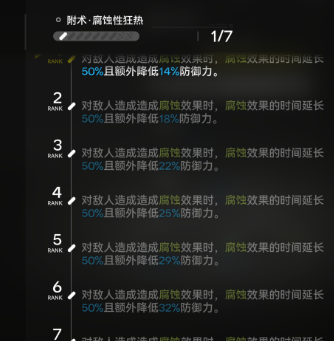 这把武器主要是以意志强化作为基础,搭配强力的腐蚀特效,就可以形成亮眼的作用。爆破单元的核心在于三维属性的精准配比,主属性一直提升,从初始10点慢慢提升到90点,可以给技能伤害提供稳定的支撑。自然伤害提升,从60%慢慢叠加到50%每一次的攻击都可以打出足额的属性伤害。比较有特色的就是腐蚀性狂热技能,将腐蚀效果的战略价值直接拉满,可以延长50%的腐蚀持续时间,还能额外的降低敌人的防御能力,最高可以达到43%.