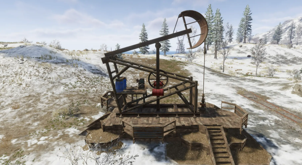 游戏地图上分布着不同类型的矿场,每个矿场旁边都配备了专门的挖掘设备。硫磺矿场有硫磺挖机,采石矿场有石料挖机,高级金属矿场则配备了金属挖机。除了这些常规矿场之外,像发电站和污水处理厂这样的中型据点也放置了挖油机。这些机器有个共同点,就是都需要消耗柴油才能运转起来。玩家只要往机器里投入柴油,它就会自动开始工作,持续产出对应的资源。