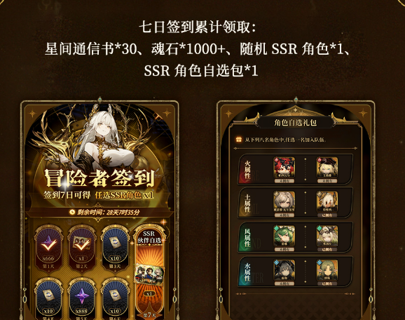 七日签到累计领取:星间通信书*30、魂石*1000+、随机 SSR 角色*1、SSR 角色自选包*1