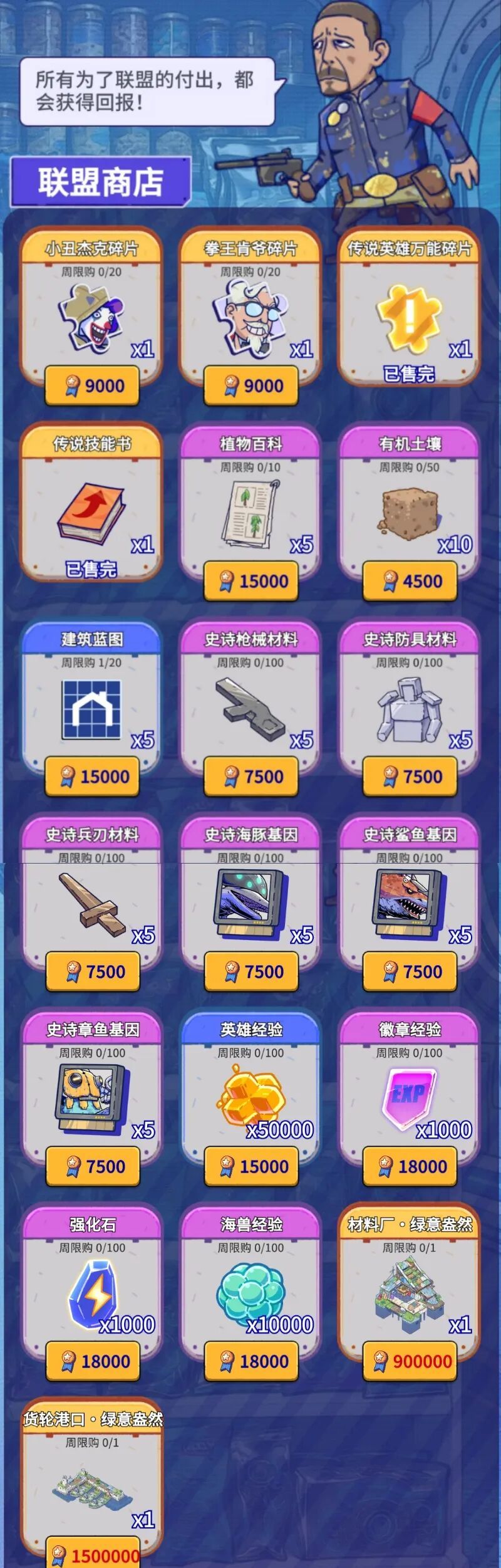 《疯狂水世界》联盟商店优先每周必换【传说万能碎片】与【传说技能书】。随后可积攒功勋,用以兑换底部两款价值68元的限定皮肤(S1赛季勤快即可白嫖)。其他如小丑等英雄碎片,若非培养目标则不推荐,植物百科与建筑蓝图可按需换取。