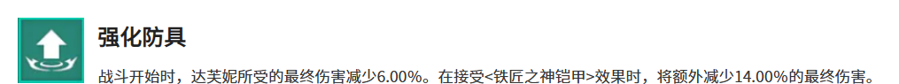 赫菲斯托斯神锤最核心的效果就是强化防具这个属性。战斗一开始的时候,达芙妮受到的最终伤害就会直接减少6个百分点,这个减伤虽然看起来不算特别多,但是在实战当中效果相当明显。更关键的是当她触发了铁匠之神铠甲这个buff的时候,减伤效果还会额外增加14个百分点,加起来就是20个百分点的最终伤害减免了。这个数值在前期已经够用,后期如果把遗物升到满级,减伤能力还会进一步提高。