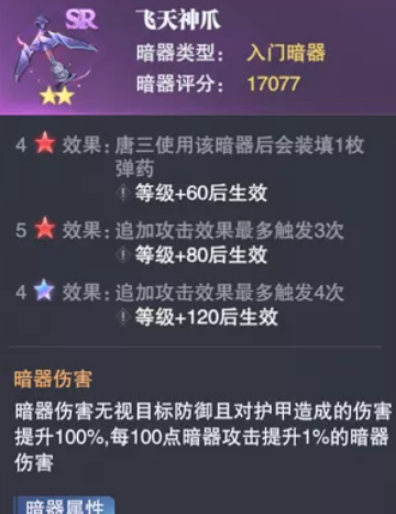 在这个游戏里,玩家可以使用的暗器很多,每一个都能起到不同的作用,飞天神爪是一个入门级别的暗器,可以让唐三使用,在等级提升了60级之后,使用这个暗器会自动装填弹药,等级提升到80级之后还能触发三次攻击效果,等级提升到120级之后可以触发四次追击效果,每一次攻击的时候能无视目标的防御,即便对方有护甲,也能给对方带来大量的伤害,每一次进行攻击,还能提升1%的暗器伤害。