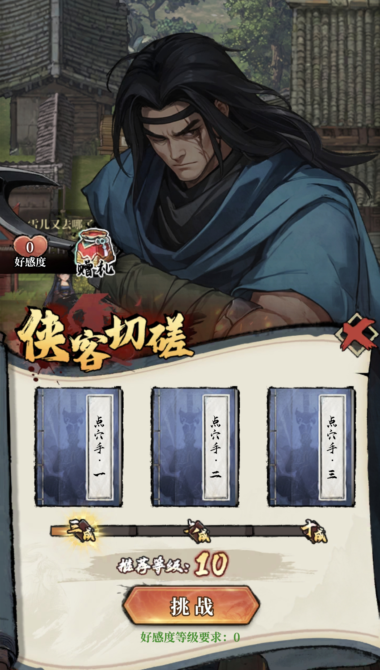 好感度对应他挑战你的功力,与侠客的好感度越高,他将用越高的功力与你【切磋】,从三成功力到六成功力到十成功力逐步挑战。
