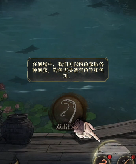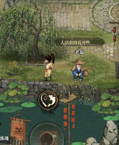 少侠可在河边老翁处购买基础钓竿开始钓鱼,鱼饵可通过野外采集或向老翁购买获得。