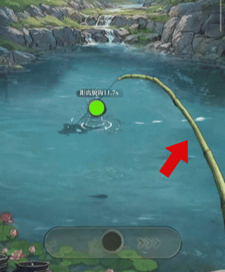 当鱼上钩后滑动操作栏的方向——左右滑动操作栏(跟着鱼竿的位置,鱼竿在左,操作杆向左,鱼竿在右,操作杆向右)保持力度平衡,消耗光鱼的体力(黄色圈出来的为鱼的体力),当鱼的体力消耗光,它自然就上钩了!