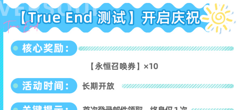 “True End测试开启庆祝”为一次性专属登录礼。所有新创建账号在首次进入游戏后,系统将自动通过邮件发放10张永恒召唤券。虽未直接给予永恒石,但按市价折算等同节省3000颗永恒石支出,且不可重复获取,属于终身仅限一次的硬性福利,务必及时查收并领取,避免遗漏。