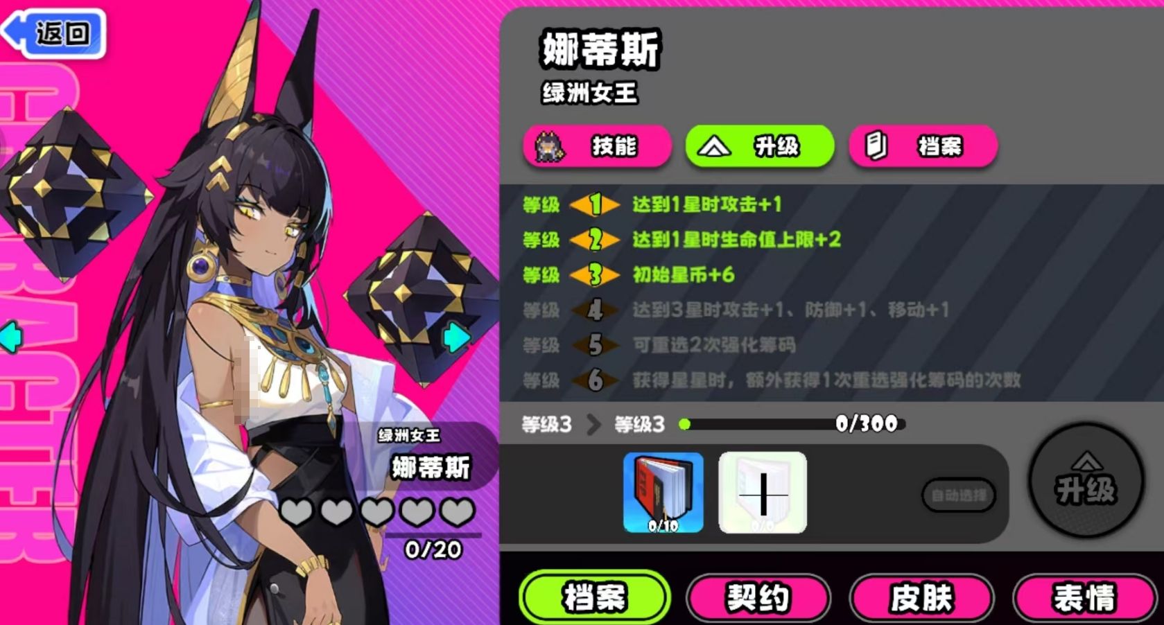 在角色养成路径上,娜蒂斯具备明确的阶段性收益。等级一即可解锁“获得一星时攻击力+1”的基础强化;升至等级二后,新增“获得一星时生命上限+2”,显著提升生存容错率,避免因基础血量不足而被低伤害技能意外击晕;等级三时,初始星币增加6点,大幅优化开局经济配置效率;后续等级四至六则持续强化其后期作战稳定性与资源获取能力,尤其在合作模式中,有助于更稳定地兑换关键道具与强化筹码。