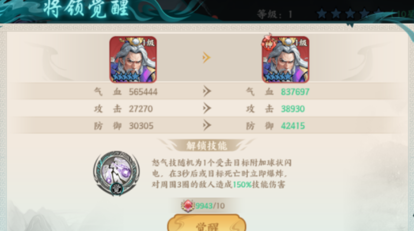那么在这里武将在觉醒的同时还可以在技能效果上面,得到一个怒气数值之类的效果进行提升,一般情况下在觉醒过程当中带来的一个能力提升效果是非常明显的,而且根据不同的武将,他们本身能够造成的战场效果来而言,觉醒之后造成的效果也是不一样的,如果是进行第一次觉醒的话,那么这里一般情况下用的就是十个觉醒石去觉醒就够了,在的这一次的觉醒成功之后,角色的右上角一般会出现一个神字的标识,通过这个标识大家就可以了解到自己的这个角色有没有进行觉醒,或者是常常看到其他角色,他的头像上面是不是有这个神字的标识,有的话就是这个武将当前也是已经进入觉醒后的强度。
