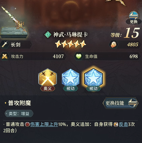其被动技能进一步放大反击收益——每次成功反击额外造成10%伤害;另一项可选奥义则建议优先选择属性类被动(如防御/生命/抗性加成),以支撑反击队所需的持续承伤能力与节奏续航。